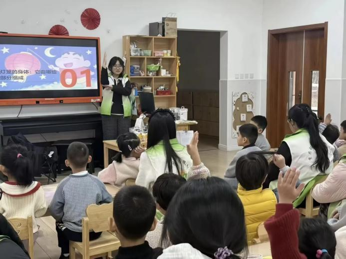 活动现场,志愿者首先展示了提前制作的初冬主题成品灯笼,借助色彩鲜艳的PPT课件,用通俗易懂的语言向小朋友们讲解灯笼的相关知识。在“初冬灯笼猜谜”趣味环节,志愿者以谜语为引导,带领小朋友观察灯笼构造,深入阐释其背后蕴含的文化寓意,并与小朋友们一对一结对协作,手把手指导孩子们发挥创意。活动尾声,志愿者带领小朋友们共同搭建“初冬童心灯笼墙”,成为现场一道靓丽的风景线。