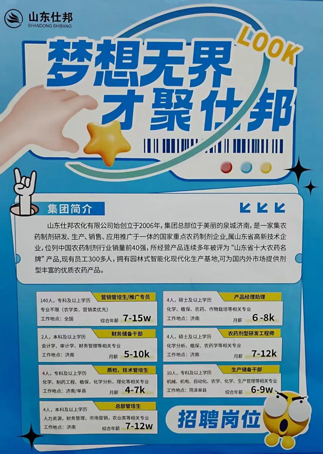 山东仕邦农化有限公司是一家集农药制剂研发、生产、销售、应用推广于一体的国家重点农药制剂企业。招聘营销管培生/推广专员140人(年薪7-15万)、质检/技术管培生4人(薪资4000-7000)、生产储备干部10人(年薪6-9万),专科以上学历,植保、农学专业优先。