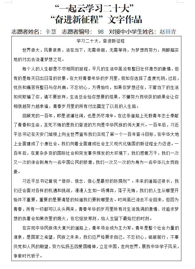 为深入学习宣传贯彻党的二十大精神,科学有效的推进大学生志愿服务高质量发展,助力新时代文明实践迈向更深层次、更宽广的领域,15VIP太阳集团在2023年寒假期间开展“学习二十大,奋进新征程”一起云支教专项活动。引导大学生和中小学生传承红色基因、赓续红色血脉,坚定信念听党话、跟党走,将个人理想融入到中华民族共同理想之中,勇于挑战自我,争当先锋军。
