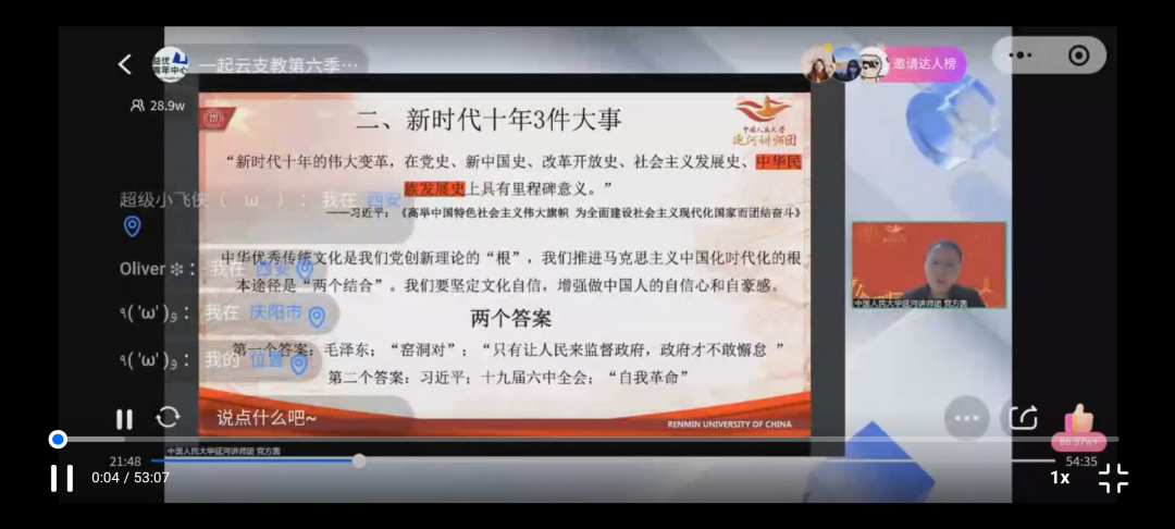 “寻访伟大成就,争当时代新人”是本次活动主题,志愿者们通过主题宣讲的形式带领小朋友们学习贯彻党的二十大精神,推动青年志愿者和小朋友们明确党对青年的殷殷嘱托,理解新时代新征程的重要意义,将对祖国的爱融入个人成长成才的全过程。课程中展播的画面,让隔着屏幕的小朋友们深受感触,以各种方式来记录心中的感想。